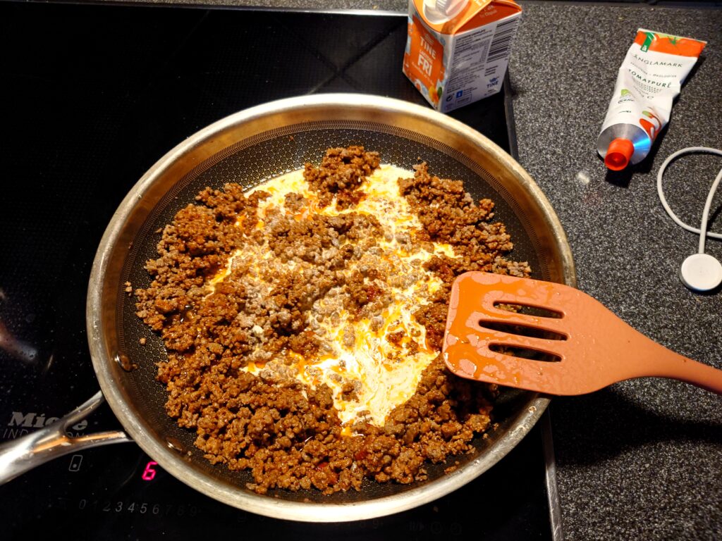 Fry the minced meat and add some of the spice mix. Add the tomato puree and the cream untill you have a sauce with the taste and consistency you want.