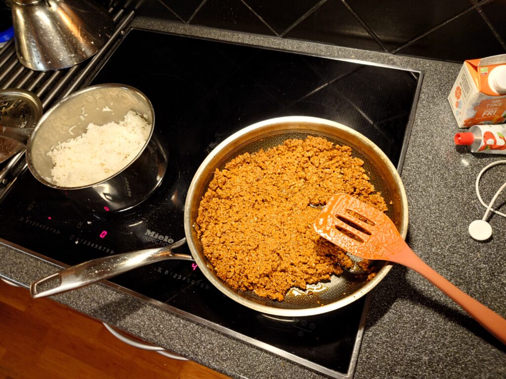 Stek kjøttdeigen og krydre med Natvigs. Ha i tomatpuré og fløte til du får en kjøttsaus med den smaken og konsistensen du vil ha.